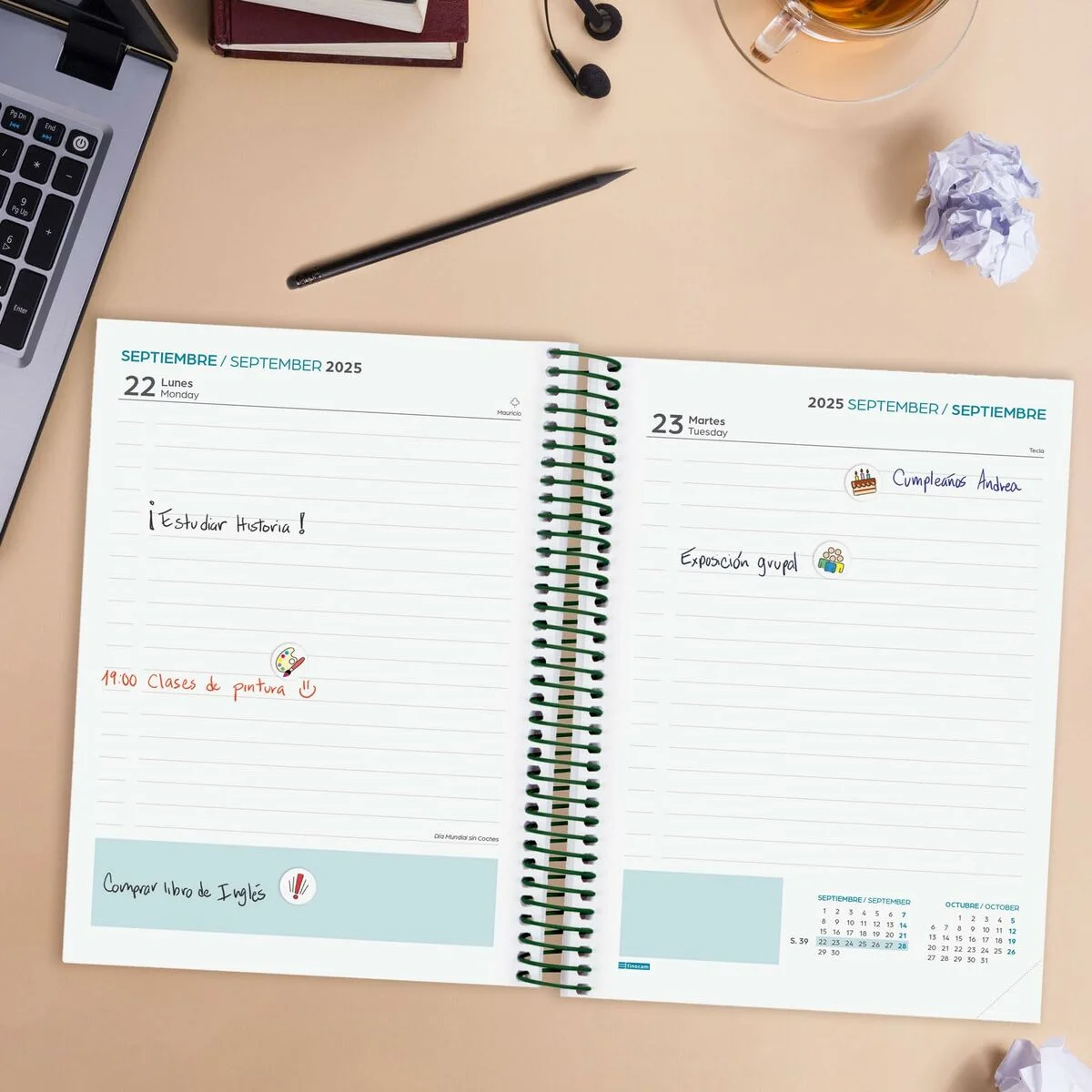 La agenda Finocam es un cuaderno diseñado especialmente para estudiantes de secundaria que buscan organizar eficazmente su curso lectivo. Destaca por su encuadernación mediante espiral metálica simple que facilita el manejo y la apertura completa de las páginas, y por su cierre con goma elástica que asegura que el interior se mantenga protegido y ordenado. Sus cubiertas rígidas de polipropileno multicolor ofrecen una gran resistencia al desgaste diario, a la vez que presentan diseños actuales y variados, adaptándose a diferentes gustos personales. Con unas medidas aproximadas de 15,5 x 21,2 cm, esta agenda tiene un formato compacto y manejable, ideal para transportar cómodamente en mochilas. El contenido interno está cuidadosamente estructurado con una distribución de una página por día, abarcando un calendario anual de 12 meses que va desde septiembre a agosto, acorde al calendario escolar, e incluye información útil como onomásticas, festivos nacionales, cambios de estación y días mundiales e internacionales, lo que añade un valor informativo práctico para planificar actividades y tiempos libres. Además, incorpora secciones de datos personales, calendarios específicos del curso, horarios distribuidos en tres trimestres, y listas recomendadas de libros, películas o series, que ayudan a completar la experiencia educativa más allá de la planificación diaria. La calidad del papel es de 80 g/m², apto para escribir con diferentes tipos de bolígrafos sin que la tinta traspase fácilmente, y está fabricado con materiales responsables como el papel FSC libre de cloro. Un detalle destacado son las pegatinas temáticas que permiten personalizar el interior, haciendo de esta agenda un producto único y motivador para su usuario. Las esquinas microperforadas facilitan encontrar rápidamente la sección correspondiente al día o semana actual, mejorando la usabilidad en el día a día. En resumen, se trata de una herramienta práctica, resistente y diseñada para acompañar al estudiante en su organización académica durante todo el curso escolar.