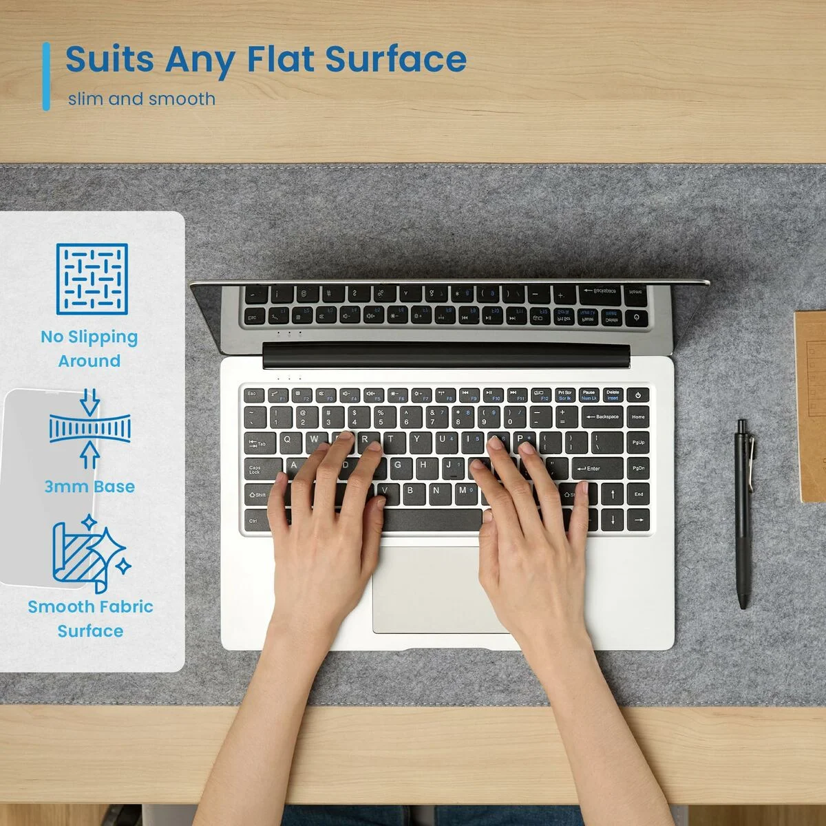 La alfombrilla puede acomodar su computadora portátil, mouse y teclado, accesorios de oficina y una taza de café o té. El material de fieltro antideslizante proporciona una superficie de descanso cómoda para escribir o jugar.