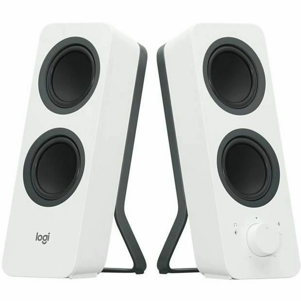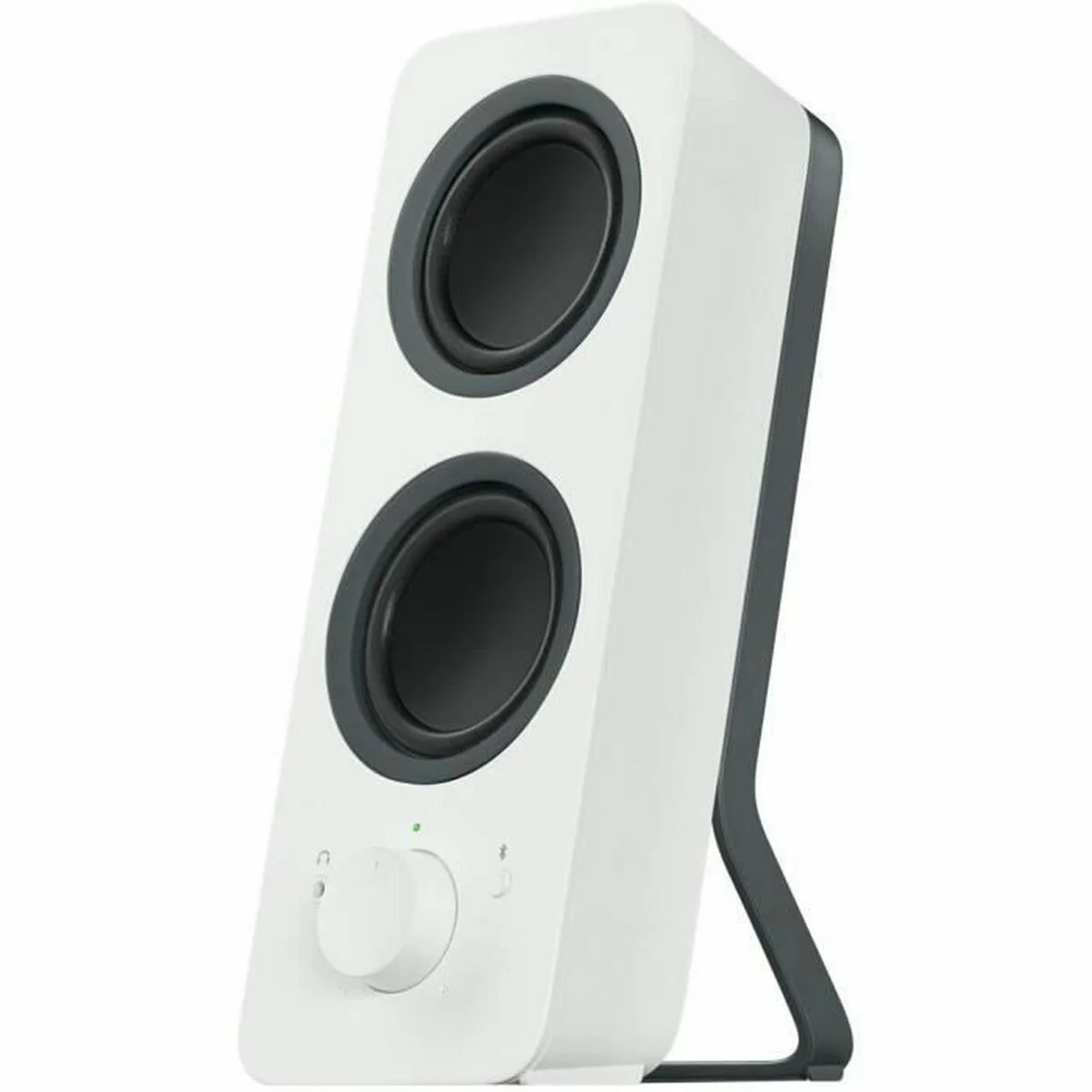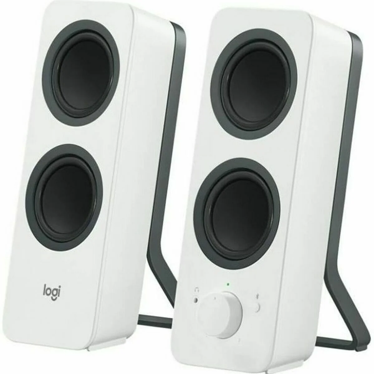 Sonido estéreo detallado en el escritorio Escucha de forma inalámbrica desde dispositivos Bluetooth®, como tu smartphone o tablet, o conecta un dispositivo, como tu ordenador, con una conexión con cable, y alterna fácilmente entre ambas conexiones para ver vídeos y escuchar música. Configuración versátil Haz streaming de audio sin cables desde dispositivos Bluetooth® o conecta un dispositivo a través de la entrada de 3,5 mm. La tecnología Logitech Easy-Switch™ te permite alternar fácilmente entre fuentes de audio. Basta con poner en pausa el audio en una y pulsar reproducir en la otra. Sonido estéreo detallado La potencia de 5 vatios RMS/10 vatios de pico ofrece un sonido intenso del diseño de cuatro transductores. Dos transductores crean el equilibrio perfecto entre los tonos medios y agudos, mientras que los dos radiadores pasivos producen los graves. Facilidad de uso Accede fácilmente al botón de emparejamiento Bluetooth, encendido, volumen y la toma de auriculares situados en el altavoz derecho.