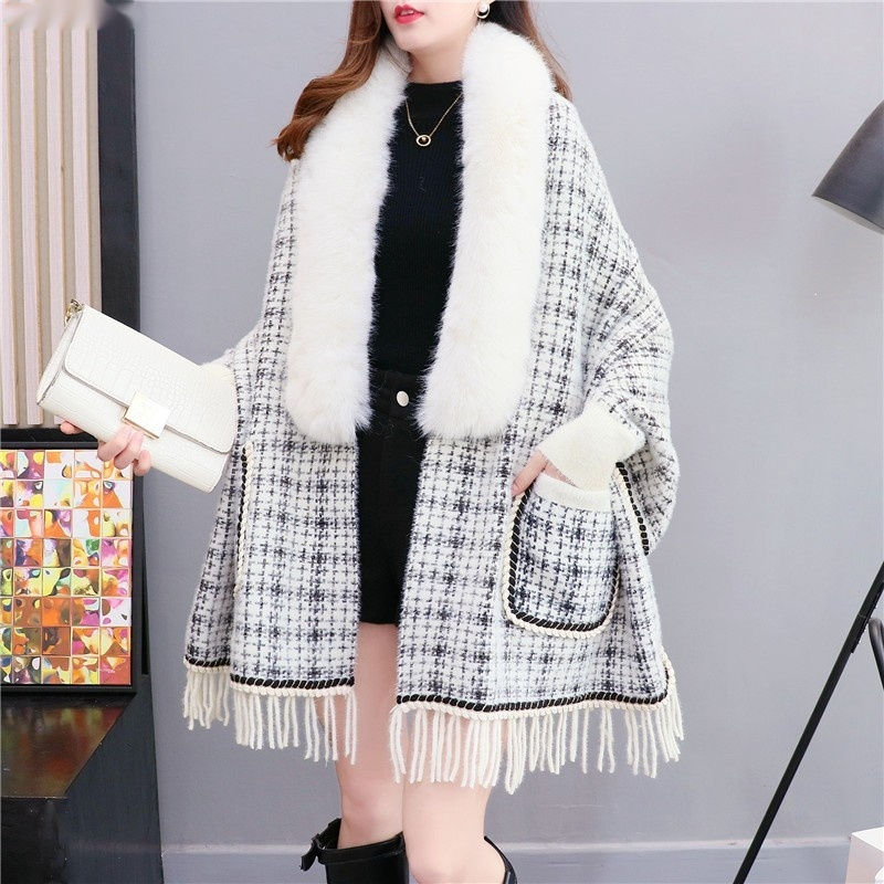Autumn And Winter New Imitated Mink Cashmere Fur Collar Cape And Shawl Plus Size Tassel Knitted Cardigan