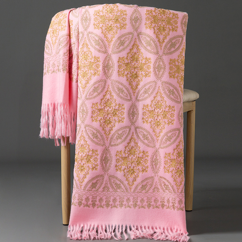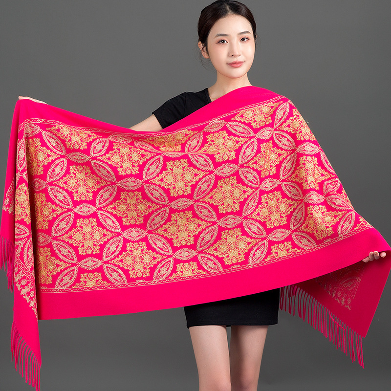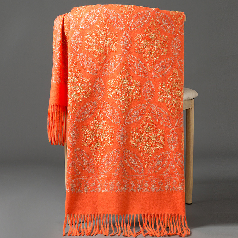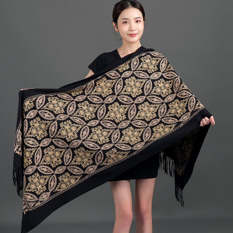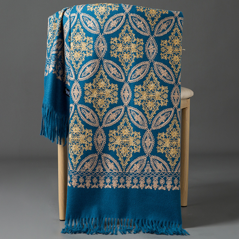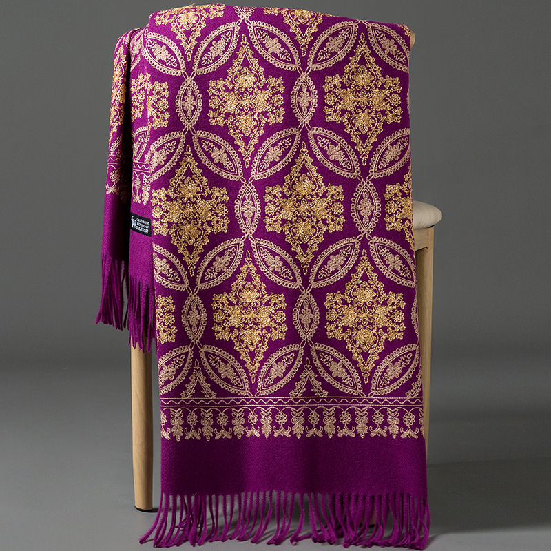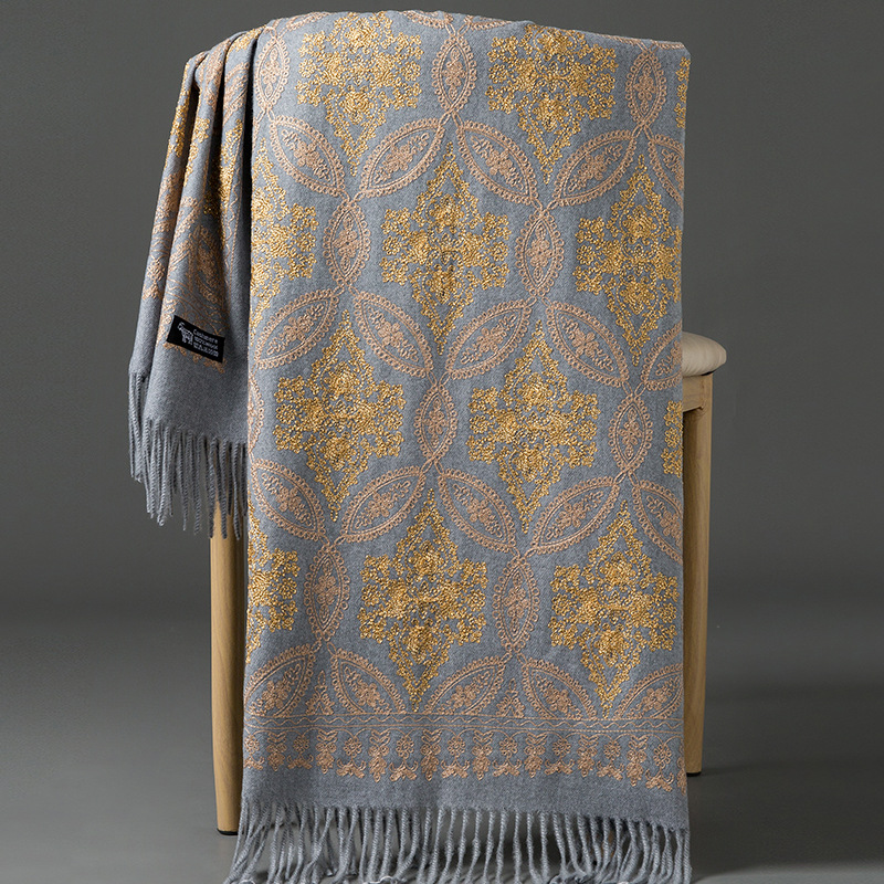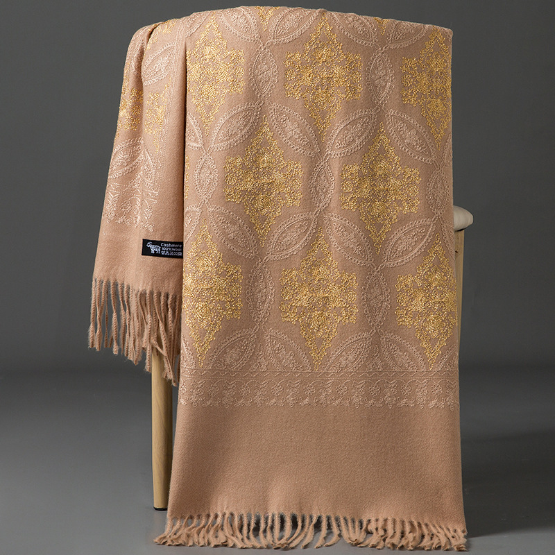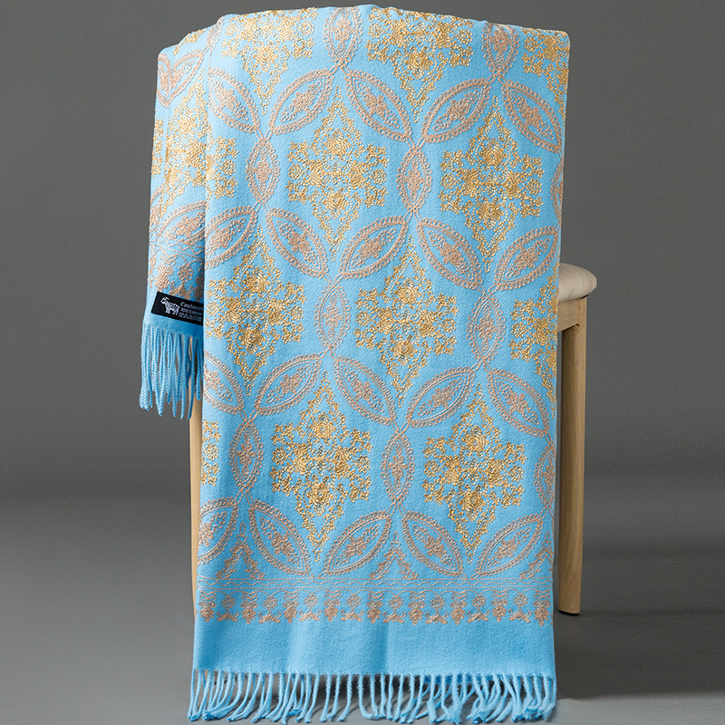Autumn Winter Embroidered Golden Silk Lily Design In Xinjiang Cashmere