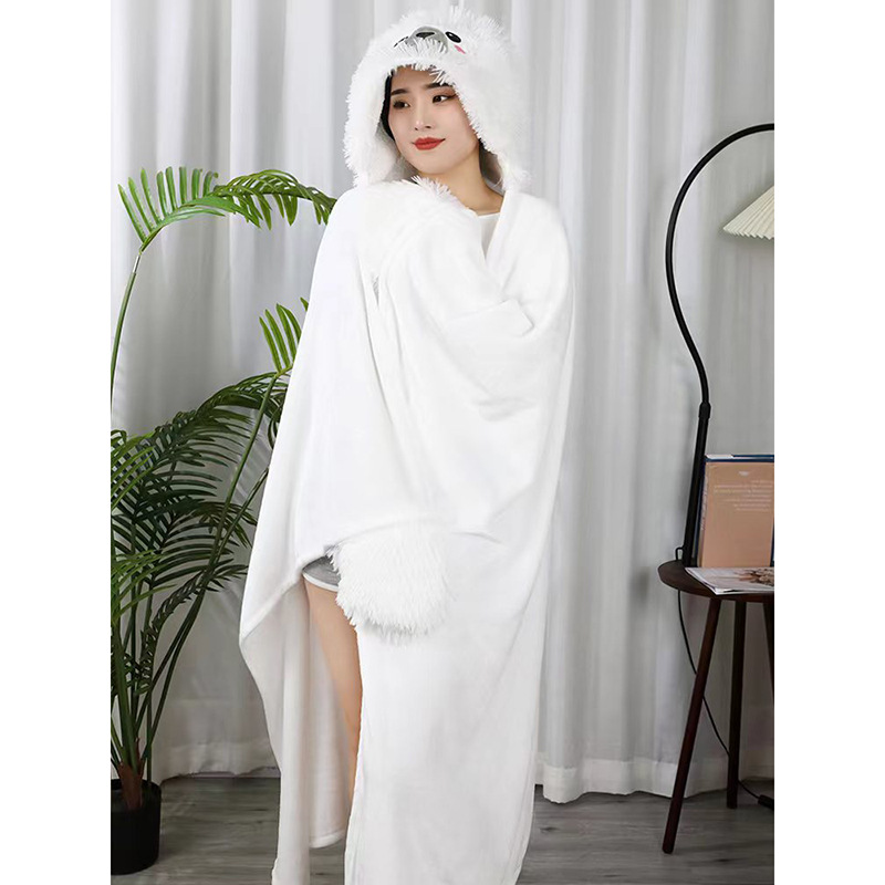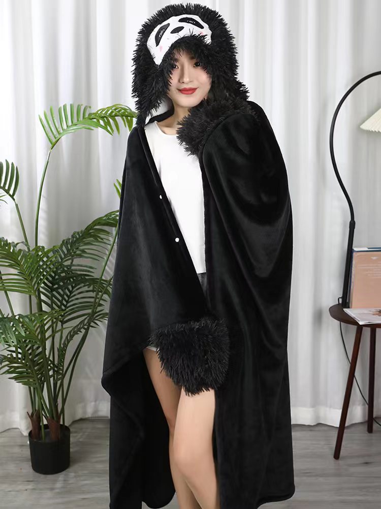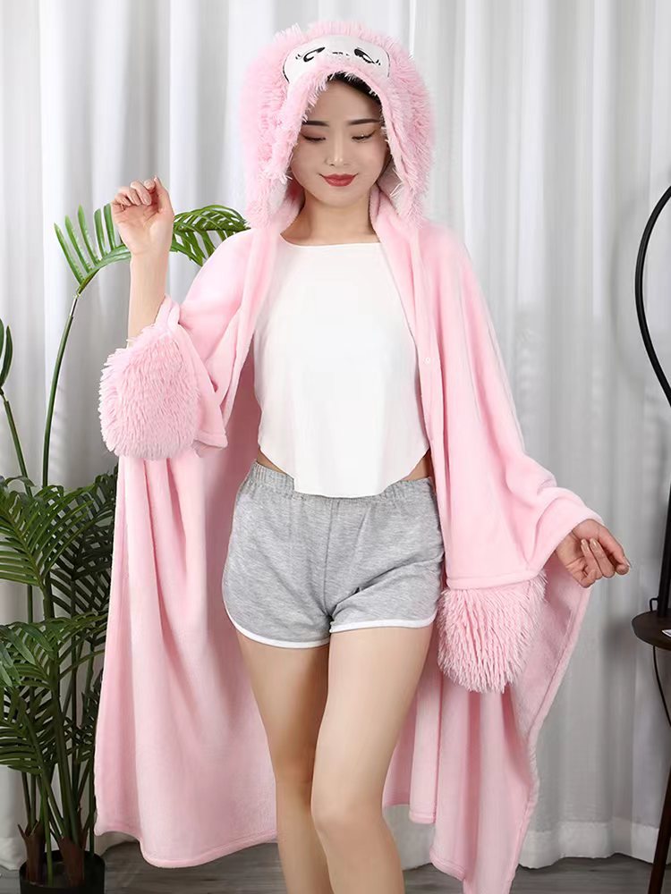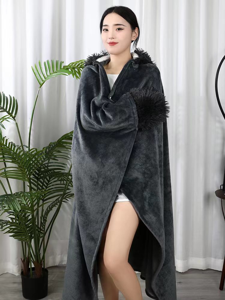 Double Layer Fleece-lined Office Nap Air Conditioning Blanket Hooded Flannel Shawl Cape -
