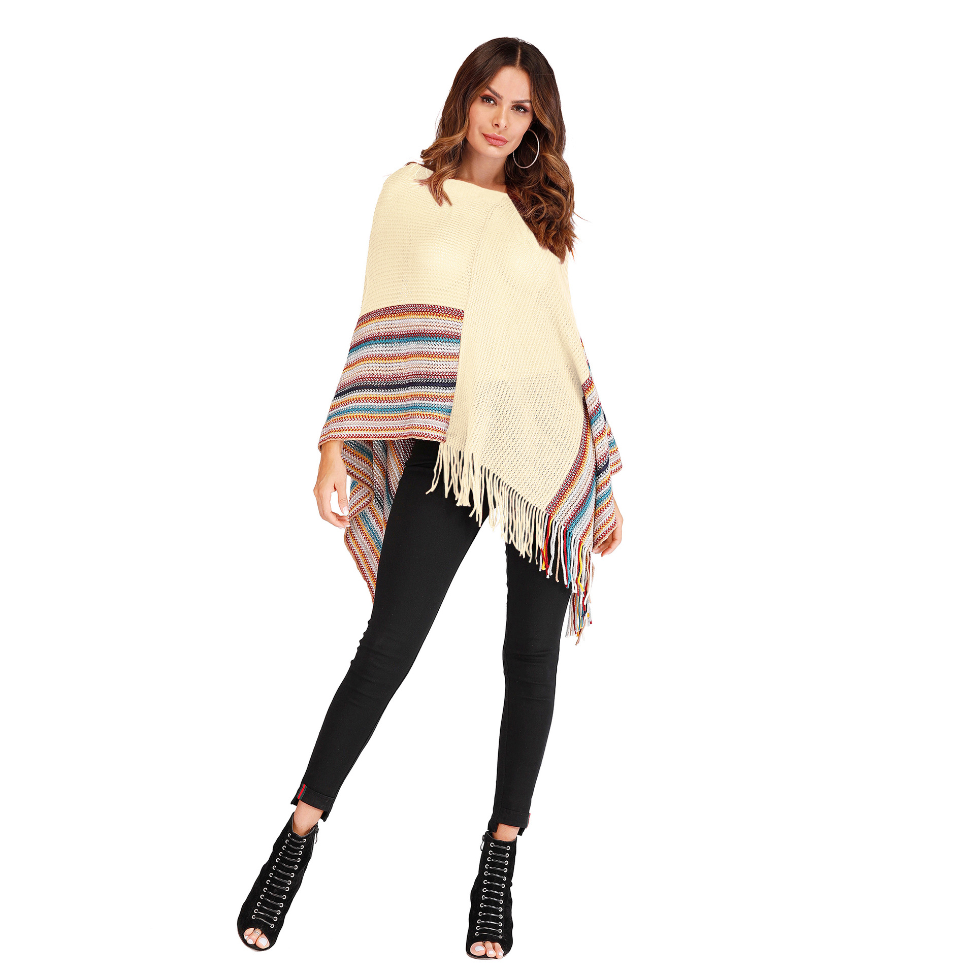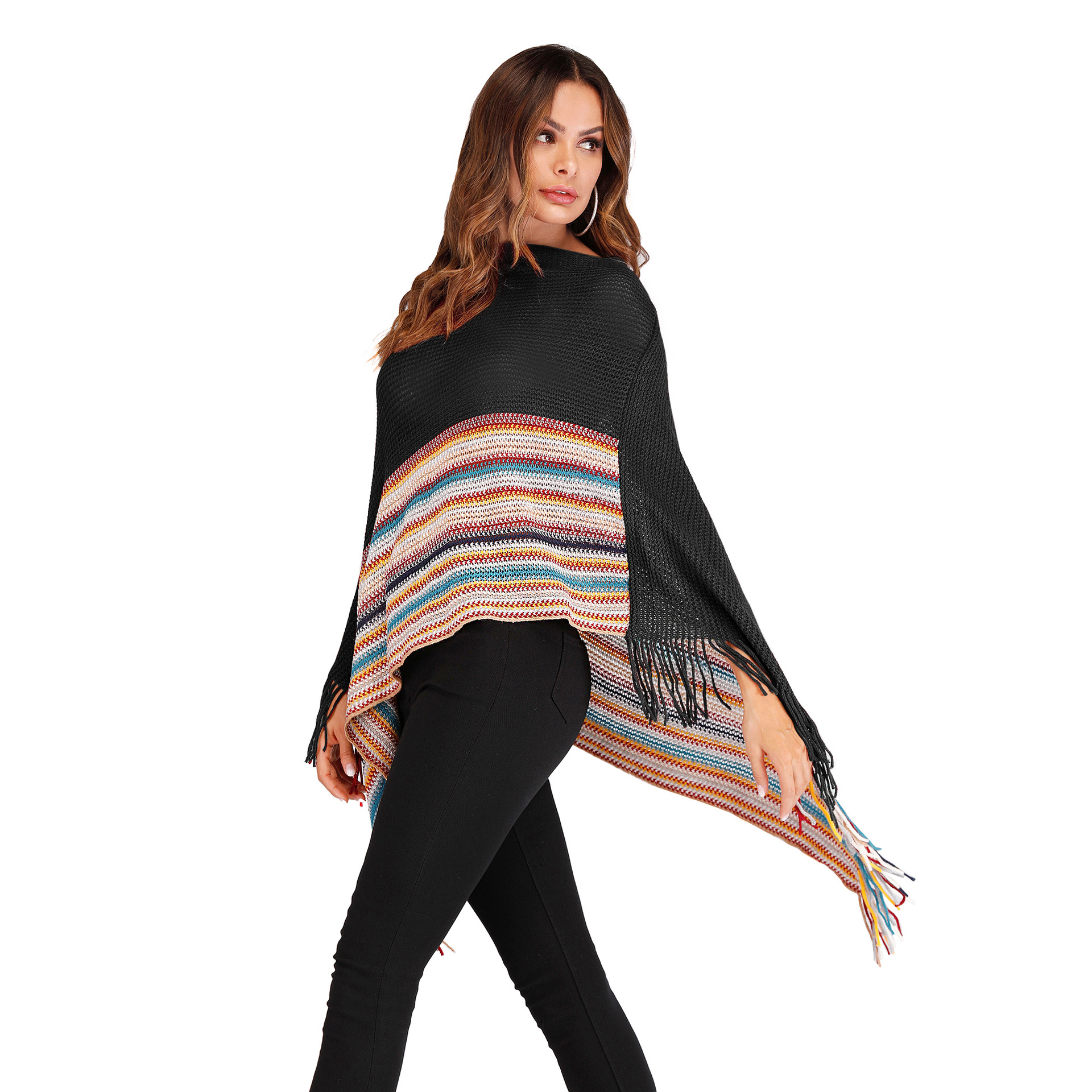Fringed high neck color block shawl