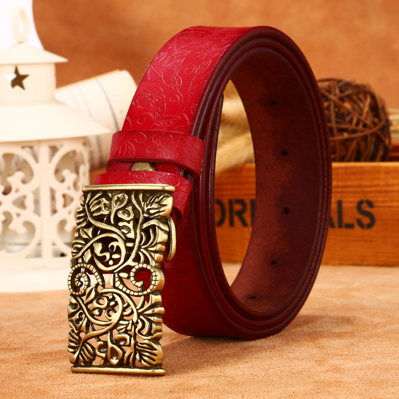 Ladies Leather Engraved With Hollow Buckle Printed Cowhide Belt