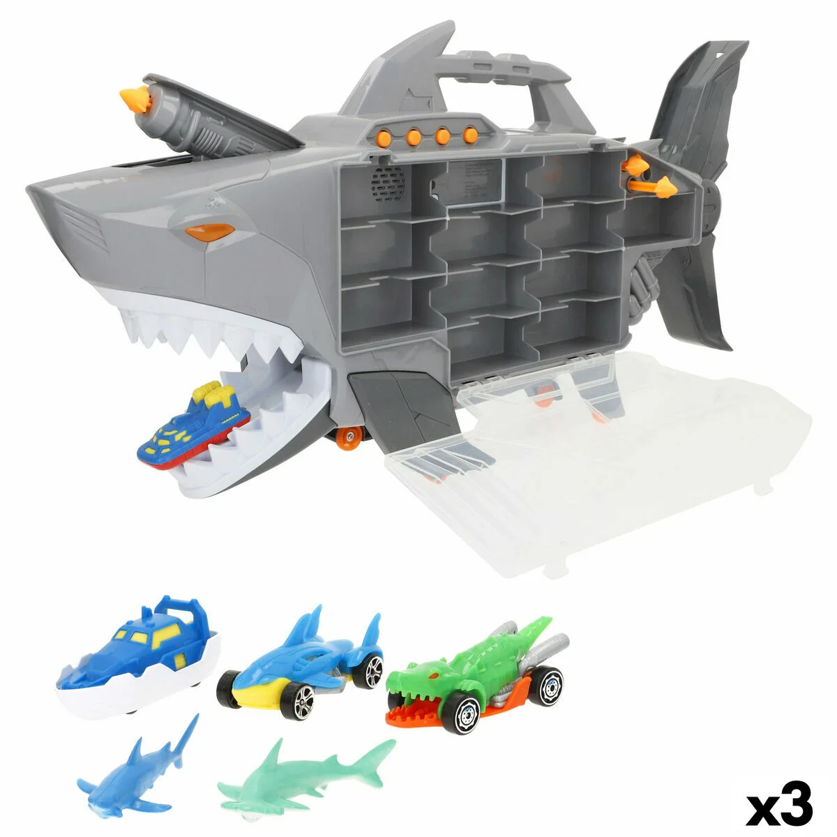 ¡Lleva la diversión a otro nivel con el temido Roboshark de Teamsterz! El tiburón robot más emocionante para niños de +3 años con ojos brillantes y 4 botones con sonidos realistas. Este increíble portacoches ofrece horas de juego lleno de acción. Su potente lanzador en la aleta con 3 flechas listas para disparar, su rampa que va desde la cola hasta sus feroces dientes y sus 24 espacios para guardar coches lo convierten en el juguete perfecto para aventuras sin fin. Además, incluye 4 coches, 2 tiburones y 2 pilas AAA para que la diversión comience de inmediato, fomentando la creatividad, la organización y la motricidad de los más pequeños. ¡Los niños se divierten y viven grandes aventuras con Roboshark de Teamsterz!