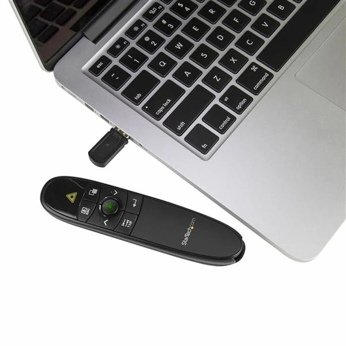 Puntero USB para Presentaciones | para Mac y Windows | con Controles de Volumen y Diapositiva | con Baterías Incluidas<br/><br/>El mando a distancia inalámbrico le permite interactuar con sus participantes, captar su atención y controlar la presentación. Es ideal para realizar presentaciones en grandes vestíbulos o centros de conferencias. Capte la atención de su audiencia Con un puntero láser de luz verde incorporado, el mando a distancia para presentaciones le permite guiar la atención de su audiencia hacia la información esencial de su contenido. Es perfecto para presentaciones de PowerPoint, sitios web o cualquier otro documento que desee compartir. El láser de luz verde funciona en superficies en que no son visibles con punteros láser de luz roja. Es visible en las superficies luminosas de pantallas LCD/LED HD o de proyectores. Involucre a su audiencia El botón de clic para presentaciones tiene una cobertura inalámbrica de 27m. Le ofrece control sobre el contenido de la pantalla mientras se desplaza por la sala, con total libertad de movimientos y capacidad de presentación como si estuviera delante de su ordenador. Le permite: Navegar por sus diapositivas Fundir a negro la pantalla para que la atención de la audiencia se centre exclusivamente en usted o en cualquier otro punto de la sala Controlar el volumen de un vídeo Situarse en cualquier lugar del espacio donde haga la presentación El mando a distancia tiene un diseño moderno y ergonómico e incluye las baterías requeridas, junto con un estuche de transporte con protección para su completa portabilidad. Puede almacenar el receptor inalámbrico en el interior del mando a distancia para presentaciones cuando no lo use, y se mantendrá apagado. El receptor USB es compatible con prácticamente cualquier ordenador Mac o Windows. Solo tiene que conectar el receptor a su ordenador portátil y ¡listo!, ya puede hacer la presentación. Producto avalado por una garantía de 2 años de StarTech.com y soporte técnico gratuito de por vida.<br/><br/>The StarTech.com Advantage<br/><br/>- Capte la atención de su audiencia y diríjala hacia contenido específico en pantalla, mediante el uso del puntero láser integrado<br/>- El láser de color verde vivaz produce mayor visibilidad en proyectores y pantallas LCD/LED HD que los punteros convencionales de color rojo<br/>- Interactúe con sus participantes, desplácese con confianza por el espacio donde realiza la presentación, gracias al rango inalámbrico de alcance de hasta 27m