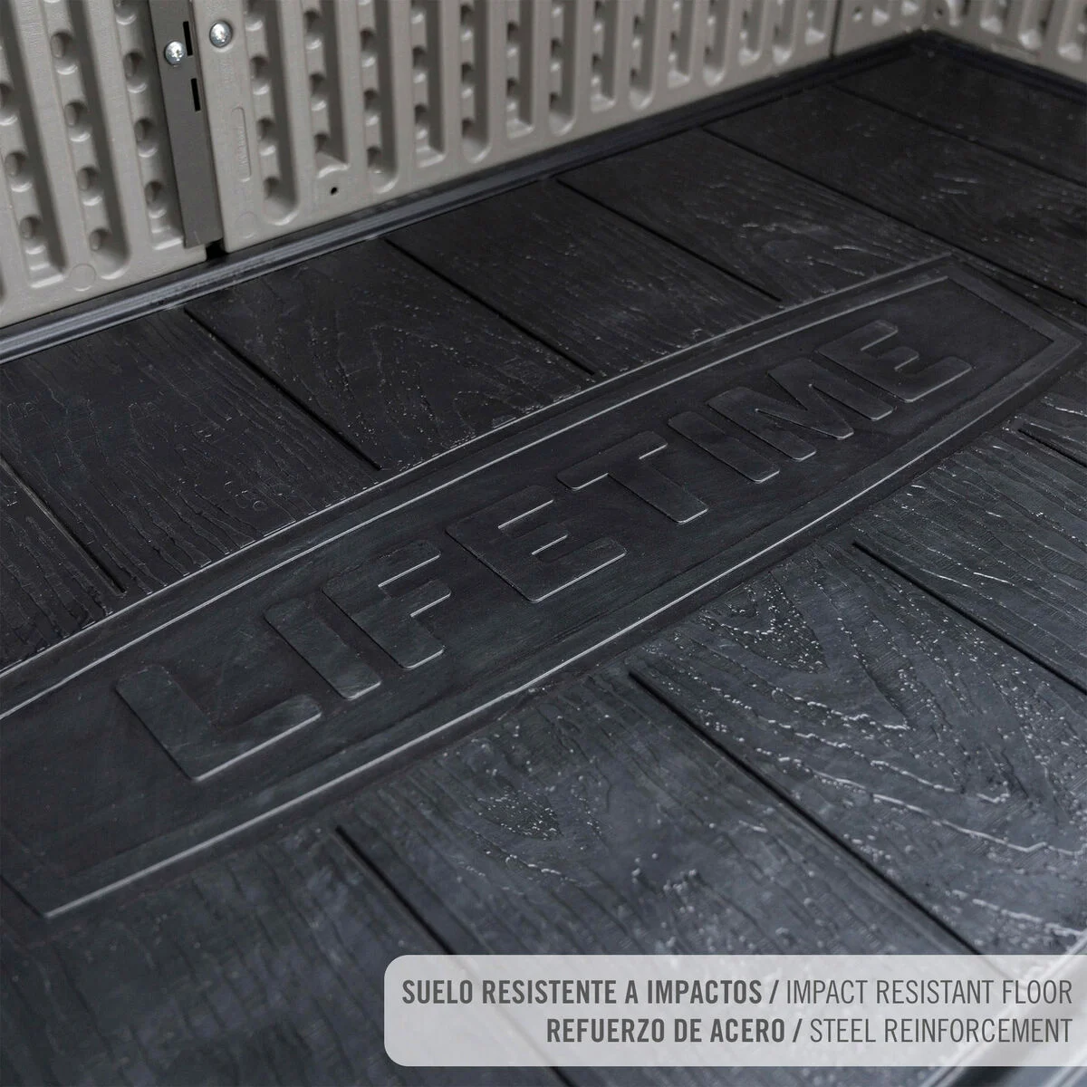Optimiza el almacenamiento en tu jardín o terraza con el armario exterior Lifetime Rough Cut™ de 1.350 L, diseñado para organizar herramientas, fertilizantes o pequeños objetos de forma accesible y protegida. Su estructura de doble pared de polietileno de alta densidad (HDPE) con refuerzo de acero garantiza estabilidad y resistencia a la intemperie sin necesidad de mantenimiento. La textura Rough Cut™ imita la madera natural, pero sin riesgo de decoloración ni grietas con el paso del tiempo. Equipado con puertas dobles de fácil acceso y sistema de cierre con pestillo y orificio para candado (no incluido), permite mantener su contenido seguro. Además, cuenta con 4 estantes internos y 4 colgadores de pared para herramientas, facilitando la organización del espacio interior.
