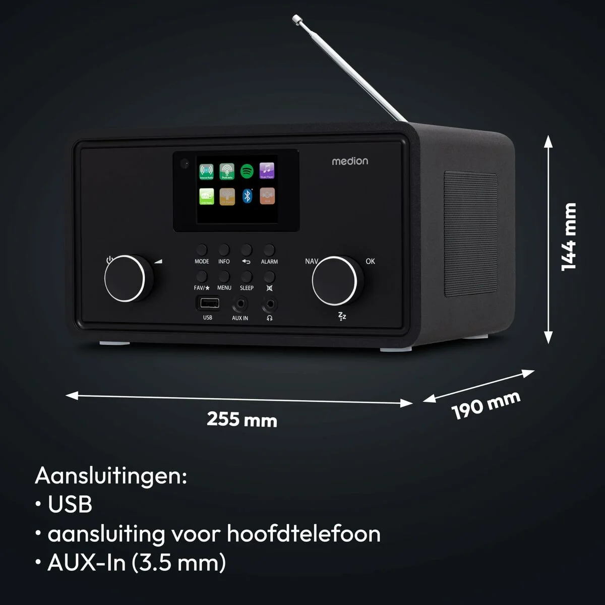 MEDION LIFE P85027. Tipo de radio: Personal, Tipo de sintonizador: Analógico y digital, Bandas de radio soportadas: AM, DAB+, FM. Potencia estimada RMS: 20 W. Tipo de visualizador: TFT, Diagonal de la pantalla: 7,11 cm (2.8"). Auriculares: 3,5 mm. Color del producto: Negro, Servicios de radio por internet soportados: Spotify, Control de volumen: Giratorio