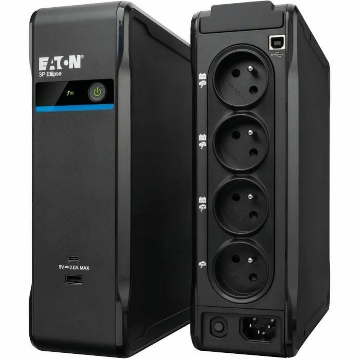 Eaton 3P900UI. Topología UPS: En espera (Fuera de línea) o Standby (Offline), Capacidad de potencia de salida (VA): 0,9 kVA, Potencia de salida: 540 W. Tipo de salida AC: C3 acoplador, Cantidad de salidas AC: 4 salidas AC, Tipo de puerto USB: USB Type A/USB Type-C. Capacidad de la batería: 9 Ah, Voltaje de la pila: 12 V. Factor de forma: Torre, Color del producto: Negro, Tipo de visualizador: LED. Certificados de conformidad: CB, CE, RoHS, WEEE, Certificación: IEC/EN 62040-1 IEC/EN 62040-2 IEC/EN 62040-3 CE UKCA Ukr Cm