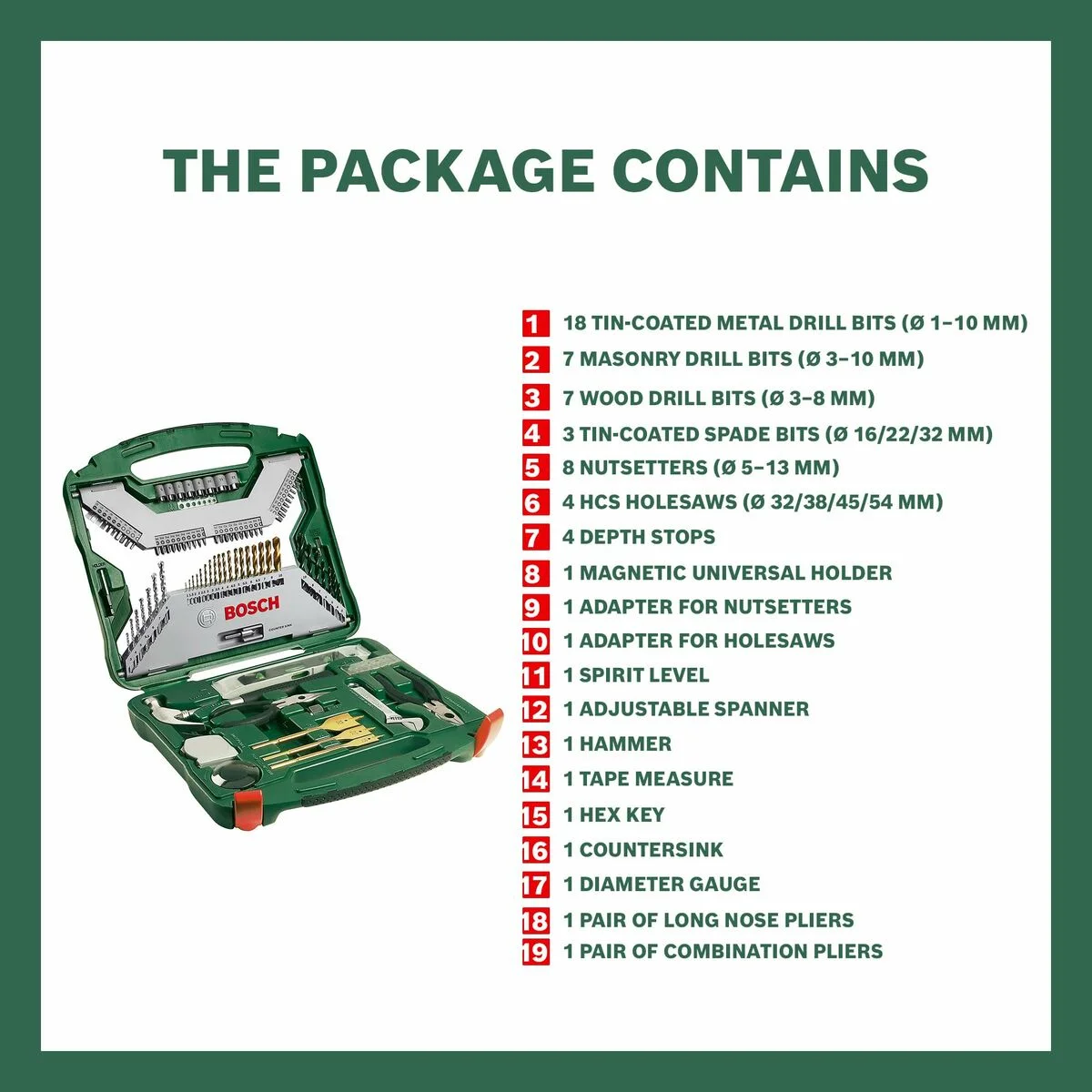 Bosch X-Line. Uso adecuado: Taladro, Diámetro de la broca de taladro: 1 cm, Longitud: 25 mm. Peso del paquete: 3,48 kg, Profundidad del paquete: 369 mm, Ancho del paquete: 340 mm. Número de brocas: 103 pieza(s)