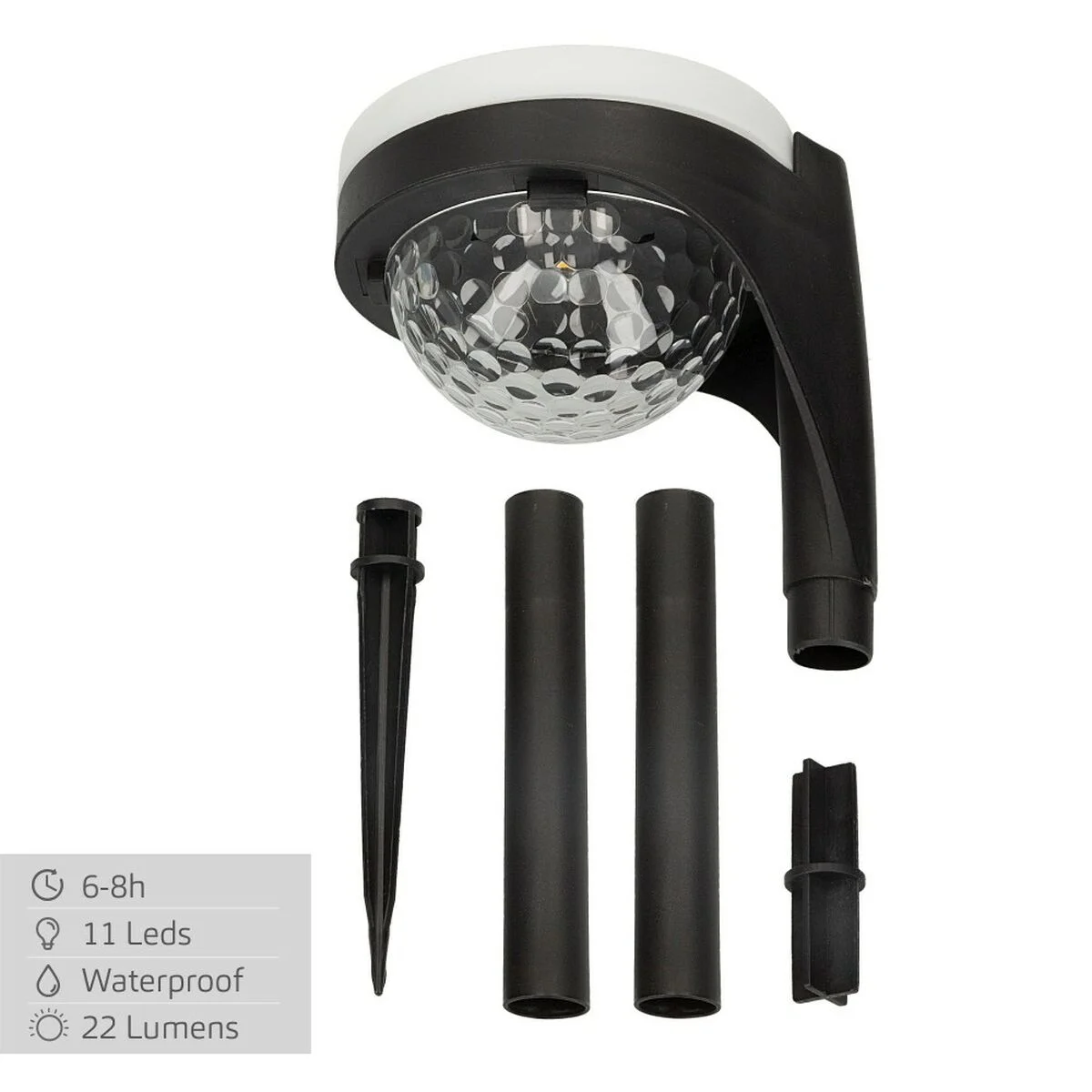 Pack de 2 focos solares Aktive Tech para iluminar el jardín, el patio o cualquier otra área al aire libre de forma eficaz y sostenible, ya que dispone de una placa solar en la parte superior que se recarga con la luz del sol. Los focos son de doble luz y cuentan con 11 LED que generan una luz con una intensidad de 22 lúmenes. Además, puede funcionar de forma continua de 6 a 8 horas una vez cargado, lo que lo hace ideal para usar durante la noche y en situaciones de poca luz. Dispone de un botón que te permite encenderlo o apagarlo para prolongar la duración de la batería cuando el foco no se esté utilizando y su construcción resistente al agua IP44 lo hace adecuado para su uso en condiciones climáticas adversas.