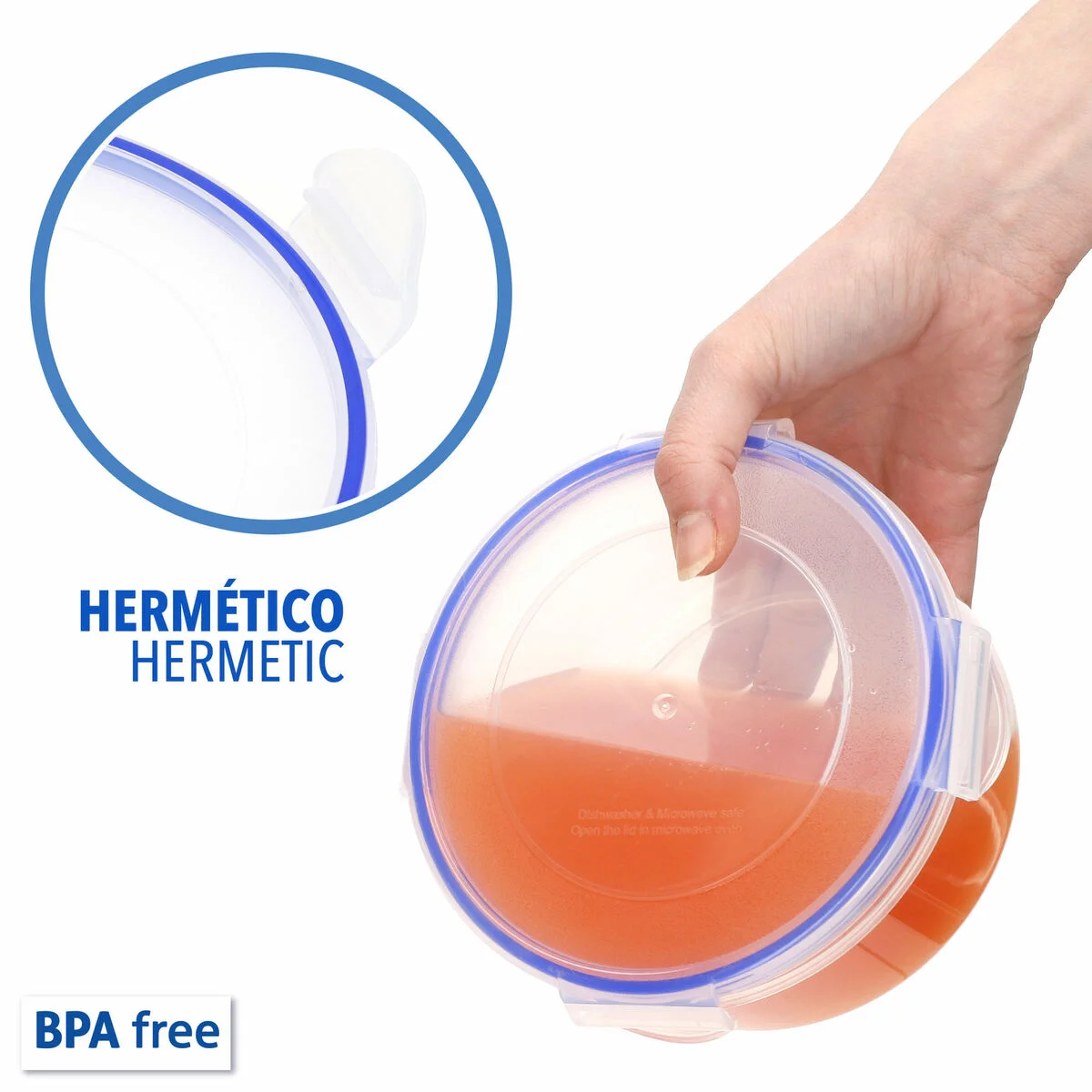 Disfruta del pack hermético de Max Home: 7 recipientes redondos con tapas que garantizan un cierre completamente hermético, ideales para almacenar alimentos frescos, líquidos o preparados. Con capacidades variadas (0,08L, 0,18L, 0,4L, 0,8L, 1,5L, 2,3L y 3,6L), se adaptan a todas tus necesidades, desde pequeñas porciones hasta grandes raciones. Fabricados en plástico sin BPA, aseguran la máxima seguridad alimentaria. Aptos para congelador (-18°C), microondas (60°C sin tapa) y lavavajillas (sin tapa). Su diseño permite apilarlos fácilmente y encajarlos unos dentro de otros cuando no los uses, optimizando el espacio en la cocina, despensa o frigorífico.