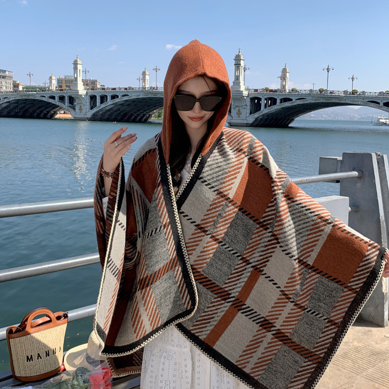 Shawl Simple Plaid Split Hooded Cape Thickened -