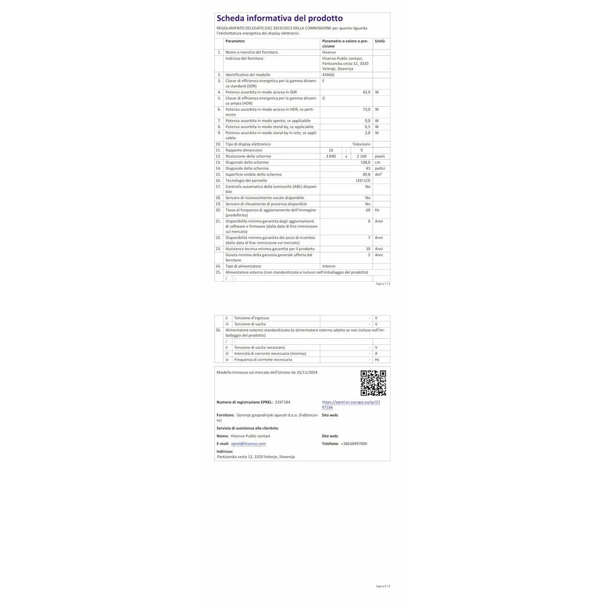 El Hisense 43A6Q es un Smart TV de 43 pulgadas que ofrece una experiencia visual de alta calidad gracias a su resolución 4K Ultra HD (3840 x 2160 píxeles), ideal para disfrutar de contenido con un nivel de detalle excepcional y colores vivos. Su pantalla LED plana en color negro aporta un diseño sobrio y moderno que se integra fácilmente en cualquier espacio. Equipado con un sistema operativo VIDAA en su versión U8.5, este televisor inteligente permite una navegación fluida y acceso a diversas aplicaciones y servicios online, ampliando las opciones de entretenimiento. Cuenta con conectividad Wi-Fi incorporada para facilitar la conexión a Internet sin cables y ofrece funcionalidades como navegación web, ecualizador, teletexto y guía electrónica de programas (EPG), mejorando la personalización y gestión del contenido. En cuanto a la sintonización, dispone de un completo receptor digital compatible con múltiples formatos, incluyendo DVB-C, DVB-S, DVB-S2, DVB-T y DVB-T2, asegurando una gran variedad de canales y cobertura en distintos destinos. La potencia sonora estimada RMS es de 14W, suficiente para un audio claro y adecuado en ambientes domésticos estándar. Su clasificación energética es E, reflejando un consumo eficiente dentro de su categoría. Este modelo Hisense representa una solución equilibrada para quienes buscan un televisor moderno con funcionalidades inteligentes, alta resolución y variedad de opciones de sintonización que garantizan versatilidad y comodidad en el uso diario.