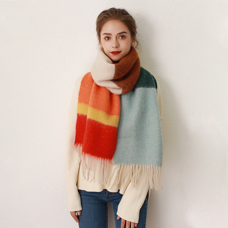 Striped Plaid Fringed Cashmere Mohair Scarf