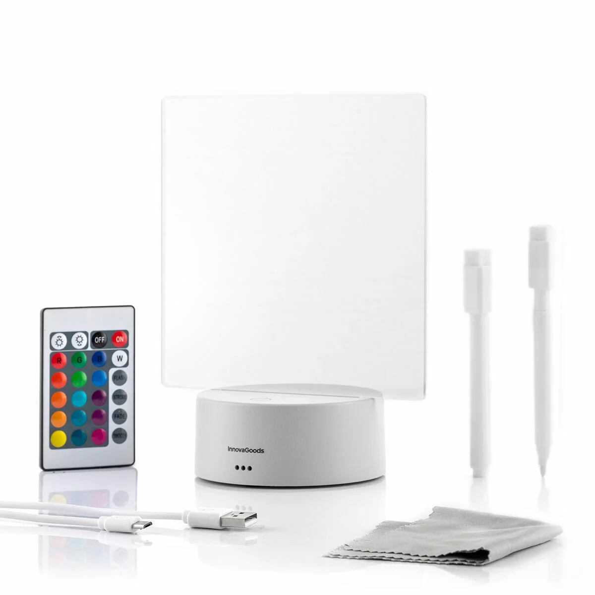 Un tablero de notas y mensajes LED ideal para todo tipo de anotaciones. Incluye 2 rotuladores, trapo de borrado, mando a distancia y cable USB. Dispone de botón táctil on/off y LED RGB con 16 colores, 5 modos de iluminación e intensidad regulable.