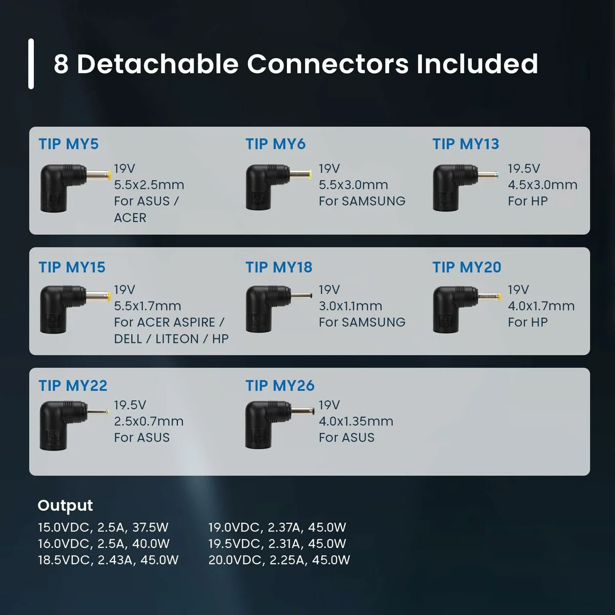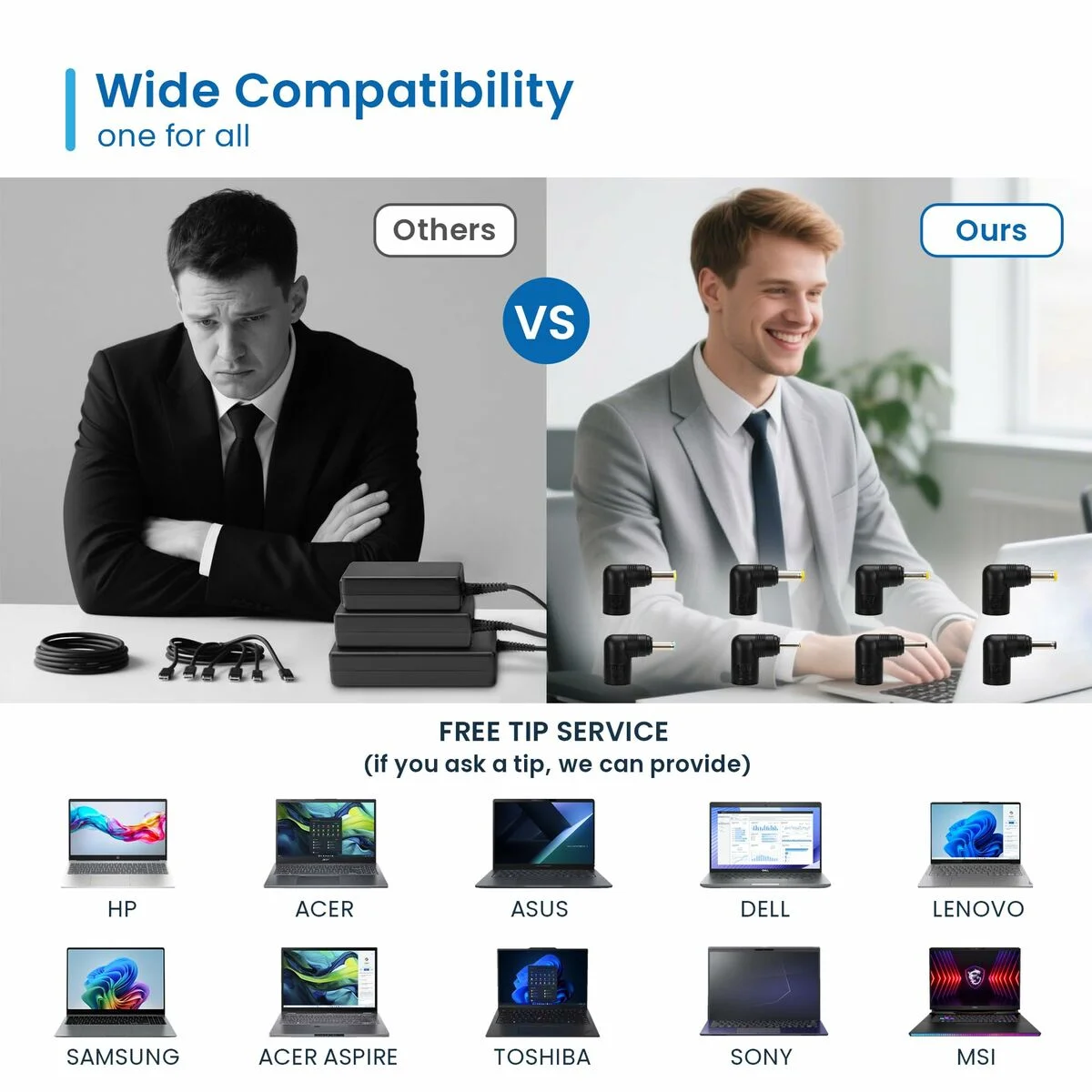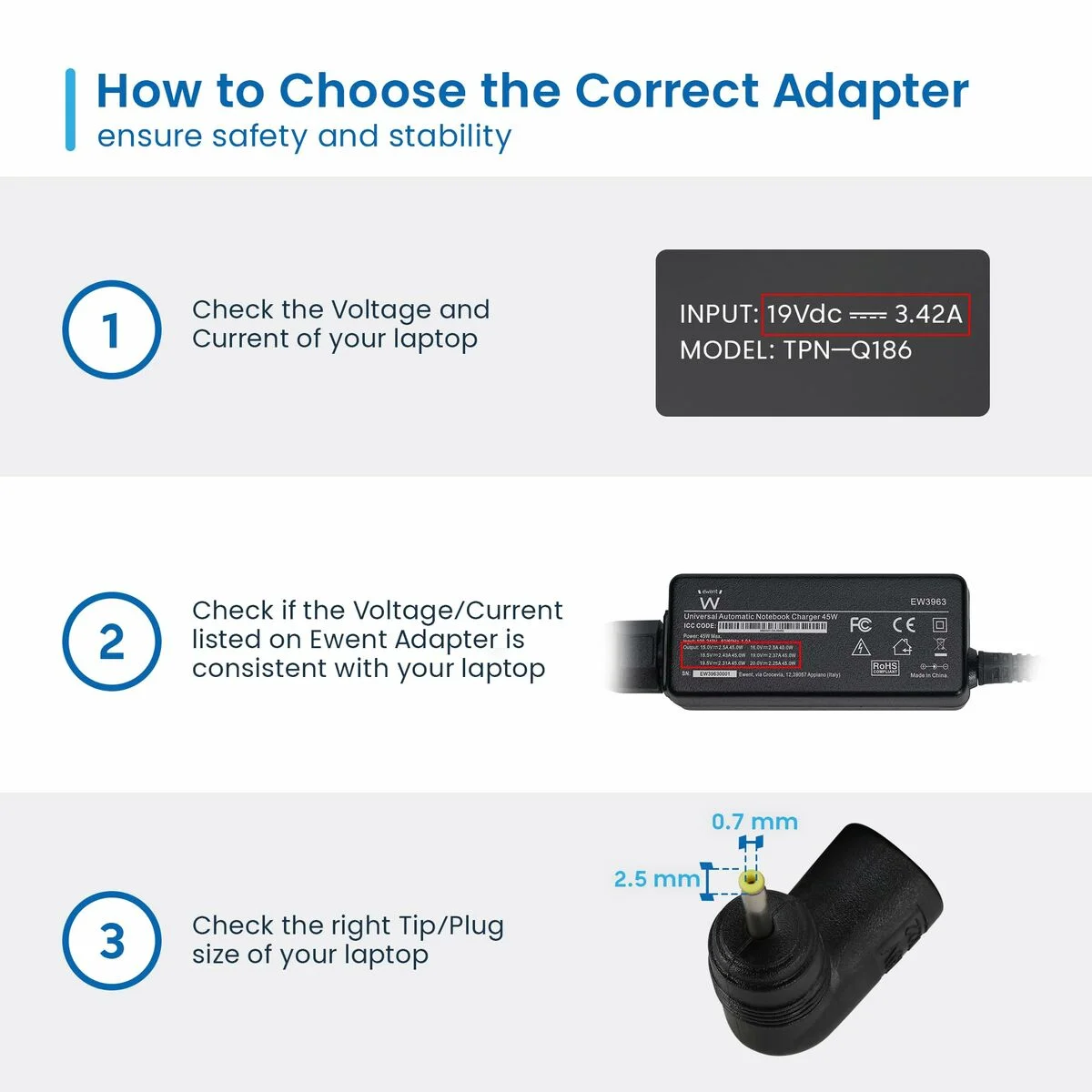 Todos los cargadores portátiles EWENT vienen con puntas sólidas de alta calidad. Se ajustan firmemente en la toma de corriente de su ordenador portátil. El cargador EWENT EW3963 viene con 8 consejos para los portátiles más comunes de Acer, HP, Dell, Asus, Sony, Toshiba, Compaq, Samsung, IBM, Lenovo, Liteon. Esta fuente de alimentación universal ajusta su voltaje de salida usando una técnica inteligente que detecta qué enchufe de alimentación está conectado. Para encontrar el tapón que se adapte a su cuaderno, no sólo no comprobar si el enchufe queda físicamente a la toma de corriente de su dispositivo, sino también comprobar si el voltaje que se indica en la punta del adaptador es correcto para su computadora portátil. Compruebe la caja de regalo de productos para una visión general de la tensión de cada cable de alimentación.