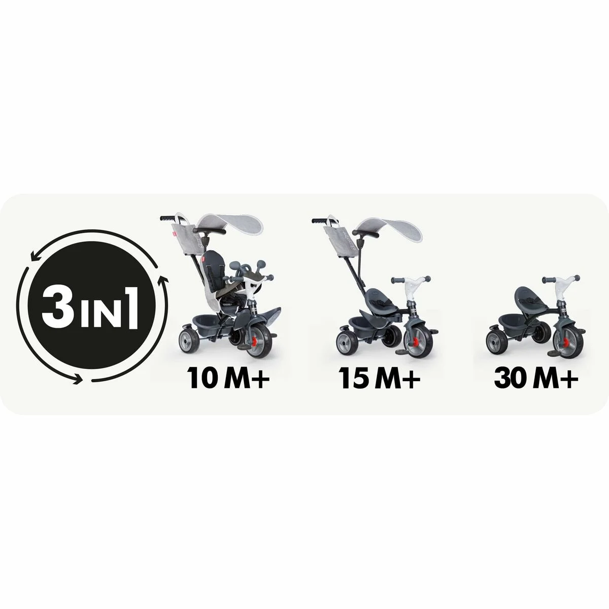 El triciclo Baby Drive Confort de la marca Smoby es un vehículo diseñado especialmente para niños a partir de los 2 años, pensado para ofrecerles una experiencia segura y cómoda durante sus primeros paseos. Este triciclo destaca por su elegante acabado en color gris metalizado y detalles en negro, que aportan un diseño moderno y atractivo para los más pequeños. Su estructura robusta y estable brinda la seguridad necesaria para los niños mientras aprenden a coordinar sus movimientos y desarrollan sus habilidades motoras. Está concebido para un uso infantil, con un tamaño y ergonomía adaptados que favorecen la comodidad y el control en cada recorrido. Además, el triciclo Baby Drive Confort está fabricado con materiales de alta calidad que garantizan durabilidad y resistencia al uso diario. Este producto se presenta con información disponible en idioma francés, indicando su mercado objetivo o procedencia. En conjunto, este triciclo combina funcionalidad, seguridad y estilo, resultando una opción adecuada para los padres que buscan un vehículo infantil práctico y resistente para niños pequeños.