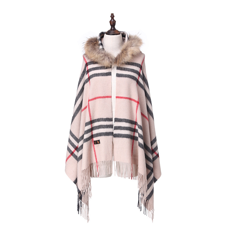 Women's Shawl Raccoon Fur Collar Wool Plaid Scarf